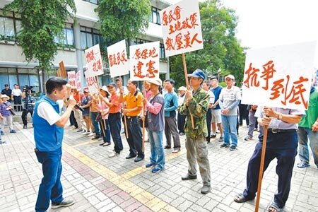 金針山居民18日持抗議標語到台東縣政府陳情,要求漢人生存權,參加國民黨立委初選的縣議員李建智到場聲援。 (莊哲權攝)