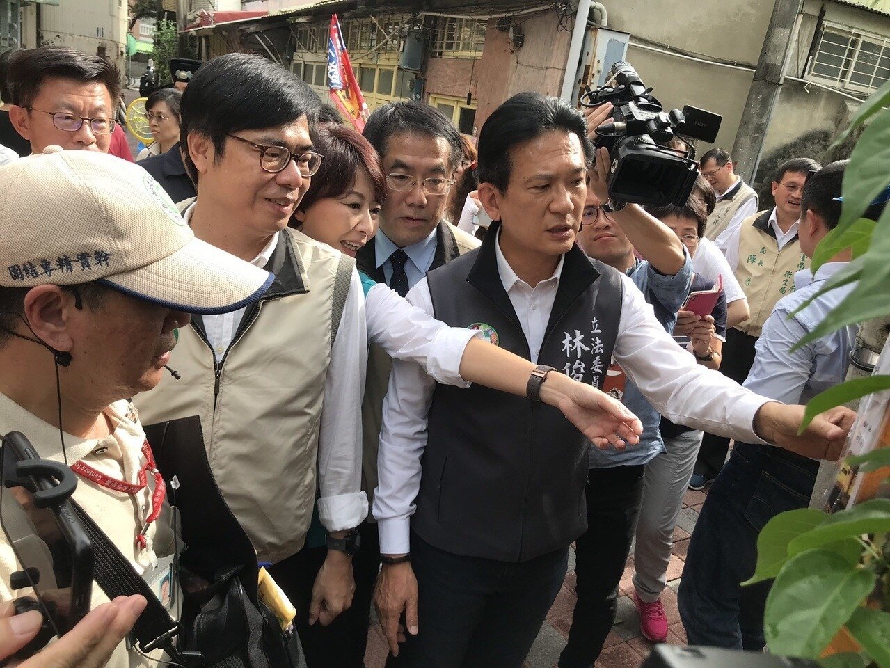行政院副院長陳其邁(左二)昨天與台南市長黃偉哲(左四)到台南市中西區視察登革熱孳清。 (聯合報記者鄭維真/攝影)