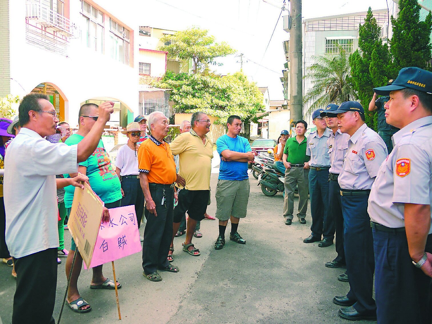 「我們要自來水」、「自來水公司白賊」,大愛居民高舉抗議看板,昨天上午齊聚旗山營運所表達抗議。大愛住戶蔣輝良說,住進大愛3年多,一年幾乎有80天停水,每次都是莫名其妙斷水,打電話給水公司又得不到回應,這樣的生活猶如次等公民。