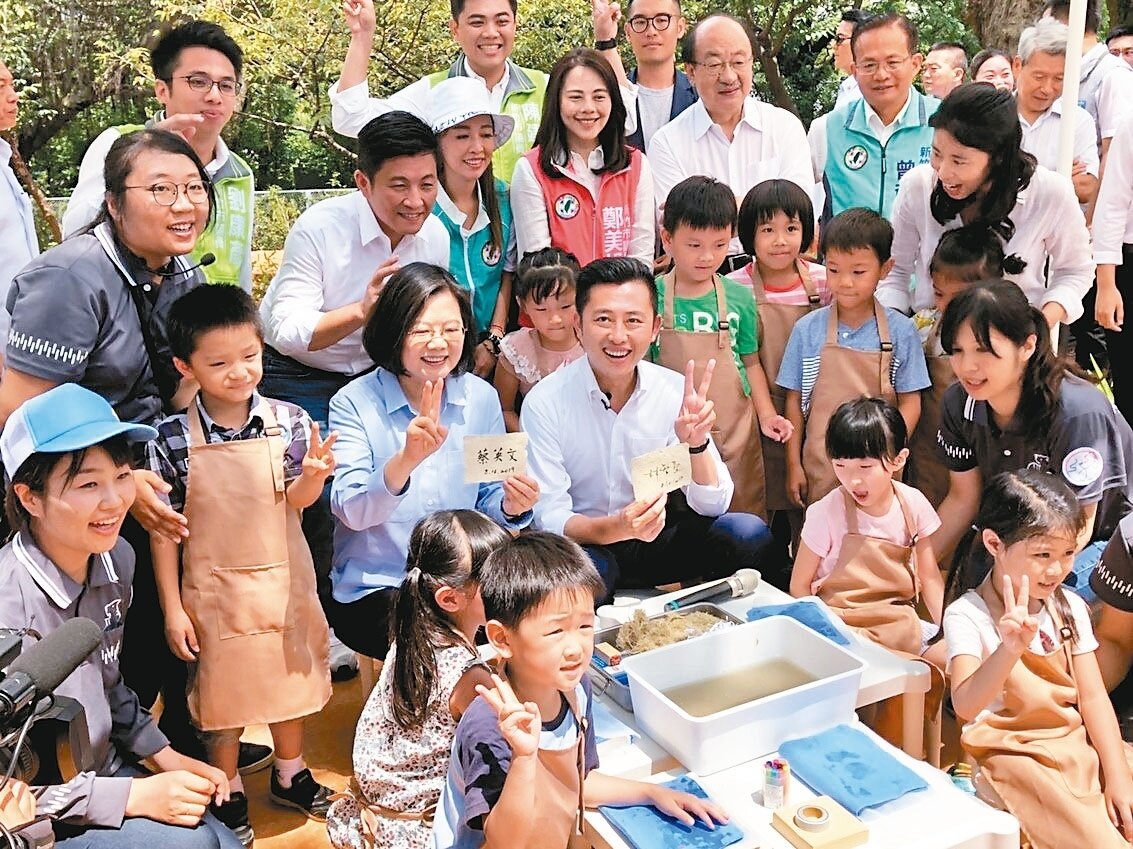 總統蔡英文(2排左3)16日走訪新竹市,上午先由新竹市長林智堅(2排左4)陪同,到預計於年底完工重新開放的新竹市立動物園,搶先參觀明星動物河馬「樂樂」的新家,也與小朋友們一起手做河馬便便紙。中央社