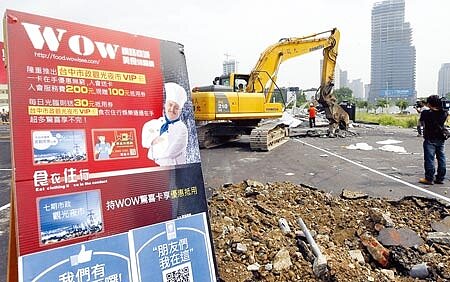 台中市府13日對違法營業的市政夜市展開拆除,怪手挖開柏油路,破壞電線管路,與遺留的夜市招牌形成對比。有業者自行雇工拆除,減少損失。(記者黃國峰/攝影)