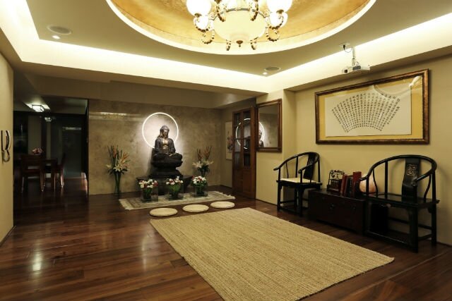 他強調,這間房的風水幾乎每個細節都有顧到,包括「堂大房小」格局佳、樑柱沒有穿過門的上方、客廳天花板設計圓形狀,代表上圓下方,上明下暗,上輕下重,圓形亦代表六道輪迴,有慈悲之意,燈設置「八」盞有「發」財諧音;和室屬ㄇ字型具有聚財功能;臥室的所有擺設都是玉帶環腰,上無樑、前無窗,避免不必要的爛桃花。