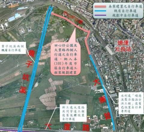 北投區貴子坑溪兩側目前已有自行車道,水利工程處的「磺港溪壓力箱涵分洪工程」復舊後也於大業路西側設置自行車專用道;另外新工處也正在進行「大度路共同管道工程」,工程復舊後亦將設置自行車道。為銜接北投區生活化自行車路網,交工處於北投區規劃大業路及田心仔公園自行車道,建置長度約1公里,以串聯既有貴子坑溪自行車道及大業路自行車道,並銜接大度路即將完成道路復舊之自行車道,另可透過大業路452巷往東連接捷運北投站。