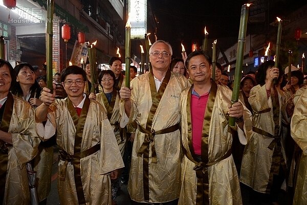 代理縣長陳志清、信義鄉長史強、縣議員史清水等人與民眾穿著限量浴衣,手持火把繞踩街。
