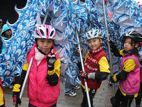 雖然戶外低溫、天空飄著毛毛細雨,但在龍潭鄉龍元宮前廣場一早即出現各式裝扮的大小朋友,這群大小朋友人人都穿載著直排輪裝備,有10多條13節和9節不同長度的直排輪舞龍,還有人妝扮成各式可愛卡通、耶誕老公公造型,吸睛效果十足。