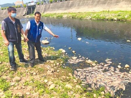 台中市議員楊正中(右)與西屯區協和里里長陳靖益痛批,東大溪從4月18日開始,陸陸續續發現魚群死亡,近日魚群暴斃更加嚴重,魚屍臭味四溢。(盧金足攝)