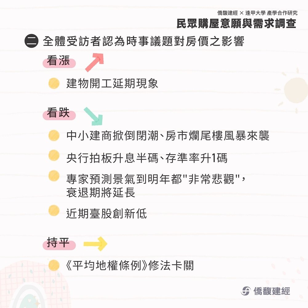 至於民眾認為哪些原因影響了房價?調查顯示上漲主因是建物開工延期;至於看跌原因則是中小建商掀倒閉潮、房市爛尾樓風暴來襲、央行升息、整體景氣悲觀及股市創新低等影響,反而是《平均地權條例》修法卡關認為「持平」。