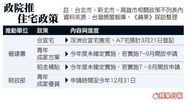 另外財政部「青年安心成家購屋優惠貸款」辦理延至今年12月31日,營建署今年度「青年安心成家方案」則尚未決定。