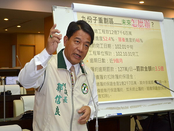 副議長郭信良指出,九份子重劃區開發嚴重落後,目前進度只有百分之52點4,預定今年10月31日完工,逾期近9個月,他為無法如期分配到土地的地主抱屈。他說,廠商無法履約,市府可以扣款,但對地主可否有賠償?根本是「政府要吃廠商、又要吃老百姓」。