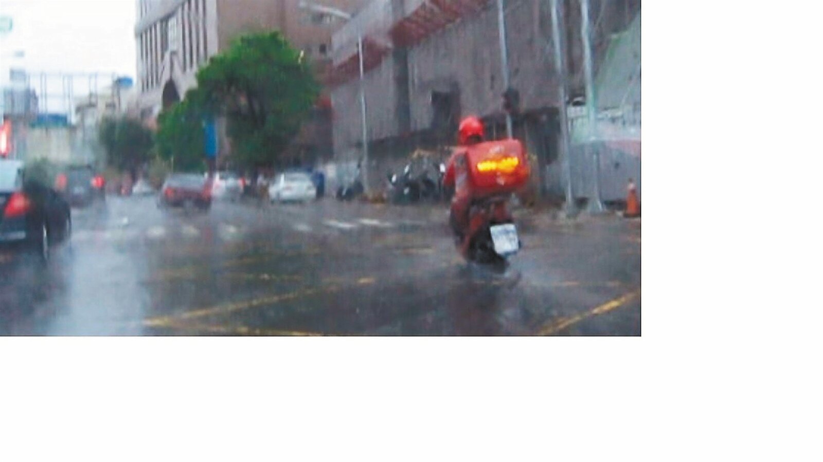 潭美颱風遠颺,昨天早上,台中市雖已解除陸上颱風警報,但市區仍風強雨急,記者在文心路上,目擊一名速食店男員工,將客人點的餐飲放進機車後置物箱,穿上雨衣外送,沿途雨勢大,他車速仍快,只為快速將餐點送到客人手中。