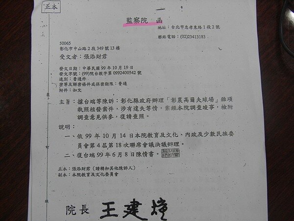 爆料卓伯源收賄的南峰高爾夫球場董事長邱順鐘,在接受記者獨家專訪時特別提出,針對彰化高爾夫球場申請雜項執照延宕多年未過,監察院在99間接獲陳情並提出提出糾舉案,彰化縣政府當時在回覆表示,非都市土地使用管制規則申請之雜項執照99年4月28日起不繼續辦理,不過彰化縣政府卻在法令修改之後,又辦理第六次彰化球場的雜項執照審查會,而業者因為認為與法令不符,並未派員參與審查會。