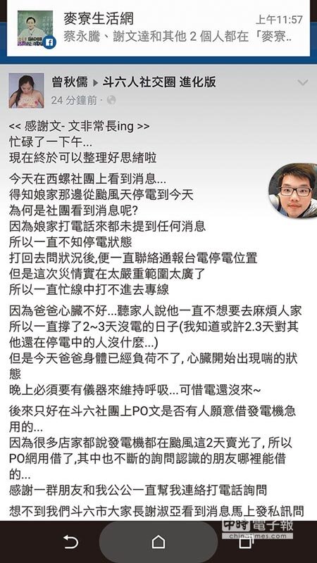 停電使人抓狂,卻也因此傳愛,雲林縣西螺鎮一名有心臟疾病的老翁需用氧氣機,但住處停電3天,斗六市長謝淑亞偶然看到老翁的女兒上網求助網友哪買發電機,主動私訊幫忙,最後陌生網友慨然出借發電機,台電也趕往搶修救命。