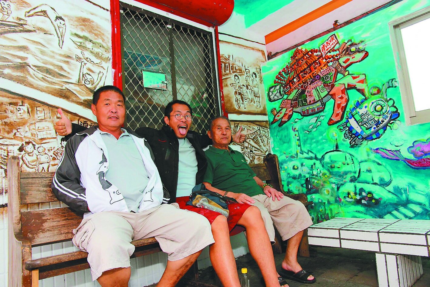 宜蘭縣南方澳南寧路公車亭原本斑駁不堪,社區邀請壁畫藝術家蕭士堯(中)與學生一起彩繪。(記者簡榮輝/攝影)