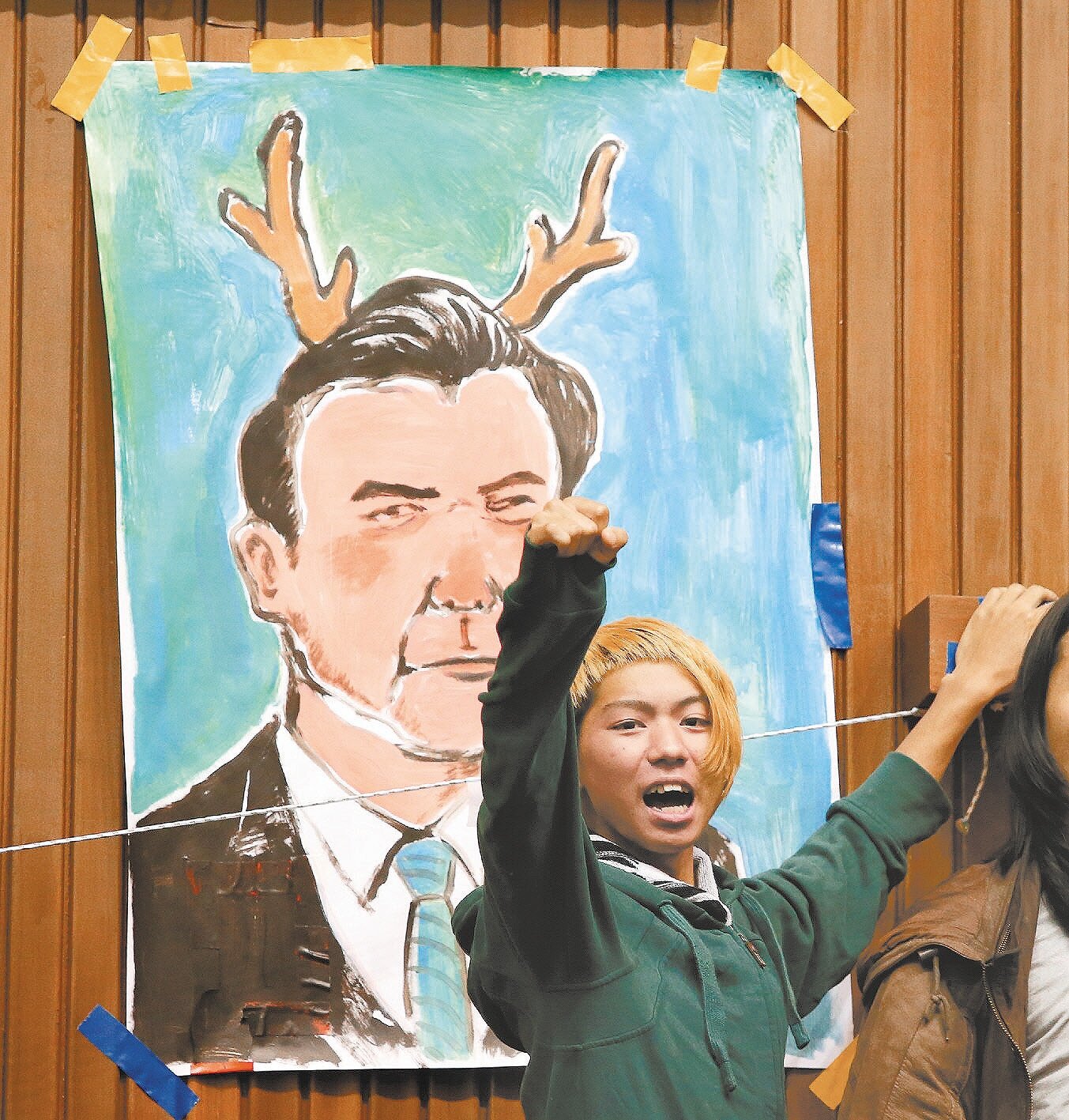 議場內學生自製創意海報,諷刺馬英九總統。(記者林澔一/攝影)