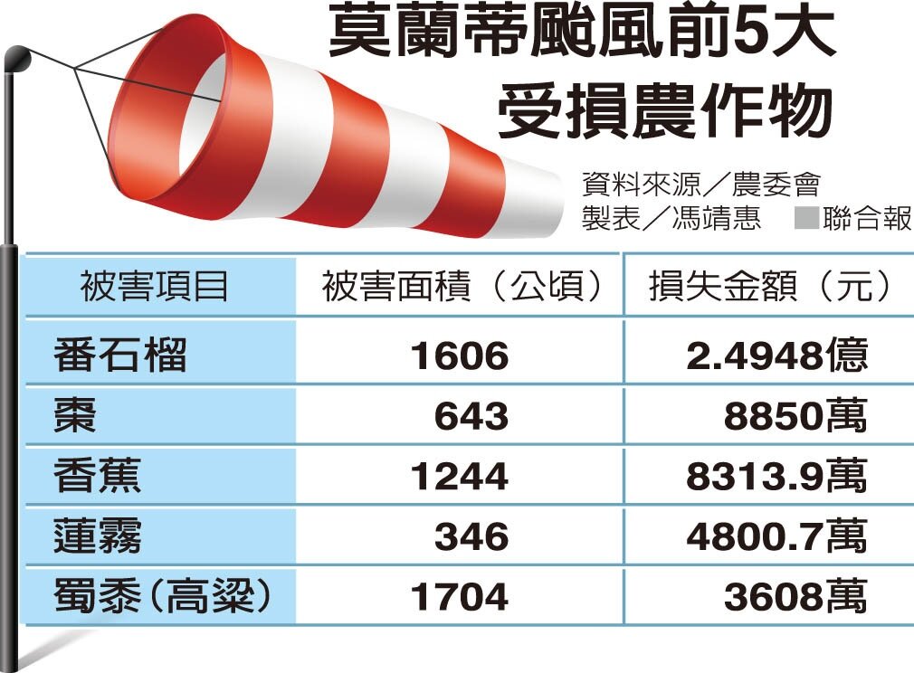 莫蘭蒂颱風至昨天已造成全台農損破八億元,芭樂、棗、香蕉、蓮霧等水果受創最慘。農委會農糧署推估,水果價格恐怕會貴到明年上半年,尤其香蕉從去年以來一直很貴,價格恐怕回不去了;明年春節高檔的水果伴手禮蜜棗,恐量少價揚,有錢也買不到。