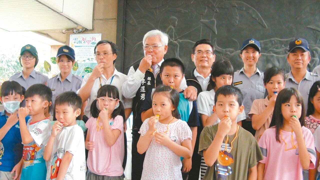 「嗶!」縣長李進勇昨天到斗六市雲林國小發送哨子,並親自將哨子配戴在學童身上,一起吹響哨子宣示校園安全不容忽視,李進勇擔心孩子們只是覺得好玩,耐心地解說哨子用途,希望孩子們將哨子隨身攜帶,遇到危險或遭遇攻擊時立即吹哨求救。