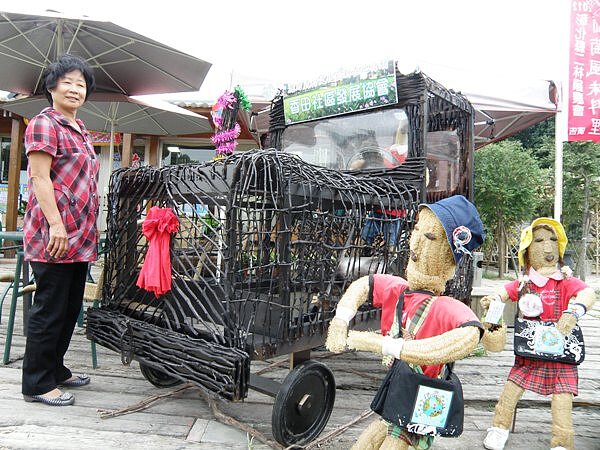 因此,社區居民到葡萄園剪取農民不要的枝條,編織在五分車火車頭的木造車體外觀,車輪則是廢棄不用的蓋子,再用農村隨處可得的菜瓜布打造司機、售票員,以及一對可愛學生,不少居民一看到就說:「對對對,以前小時候就是坐五分車上學去!」勾起了老一輩居民早年追五分車上學的往日情景。