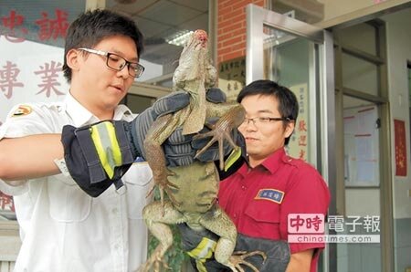「我家哪有這麼大隻的蜥蜴?」大隻仔綠鬣蜥入侵嘉義市一處民宅,女屋主被嚇得花容失色,後湖消防分隊捕獲牠,牠焦躁不安,衝撞籠子致嘴巴受傷,令人不忍,小隊長趙家賢特地把蘋果切小塊,安撫這隻意外訪客。
