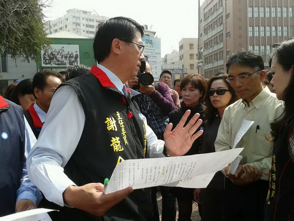 市議會工務委員會召集人謝龍介與洪玉鳳、林燕祝、黃麗招、蔡淑惠、林全忠等議員,27日會同台南市文化局長葉澤山、工務局長吳宗榮、警察局副局長林志熹等人,到湯德章紀念公園會勘國父銅像遺址,並特別向湯德章銅像獻花致敬。