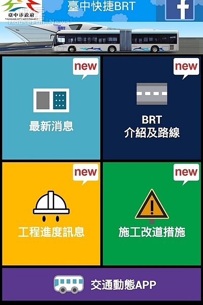 交通局新推出的「台中BRT」APP從民眾角度做設計,主要內容有:「最新消息」,提供最新BRT活動、新聞與訊息;「BRT介紹及路線」,介紹BRT特色及藍線車道規劃、藍線優先路段站位、後續路網等資訊;「工程進度訊息」則提供藍線目前最新施工進度與狀況;「施工改道措施」,提供施工期間改道資訊與道路狀況;另外,APP的頁面上並可快速連結BRT官方Facebook「我愛台中BRT」,了解臉書粉絲的互動與各項訊息。