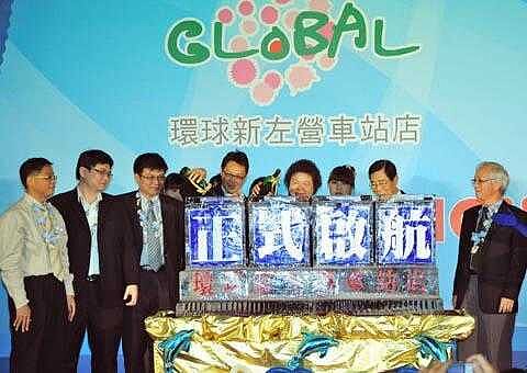 環球新左營車站店為高雄市政府都市計畫委員會去年審議通過的重大投資案,將台鐵左營站原本閒置的營運空間,打造成優質購物環境。上午商場正式開幕,高雄市長陳菊、冠德集團董事長馬玉山等貴賓共同將紅酒注入冰雕,宣告環球第五號店正式開張,結合地利交通之便,觀光及商務旅客未來將有更多美食和逛街選擇。