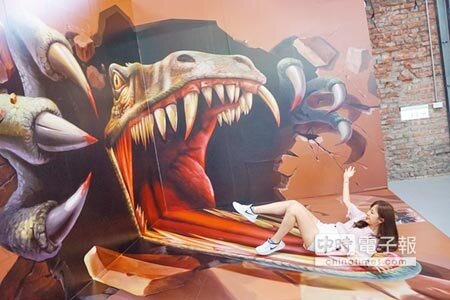 想跟恐龍互動嗎?新竹縣竹東動漫園區推廣3D展覽,今年暑假推出21幅大型畫作,其中「奔跑吧!暴龍」14公尺長大地貼,是在台灣首度展出,搭配煙霧及聲效,還將讓參觀者如歷5D之境。