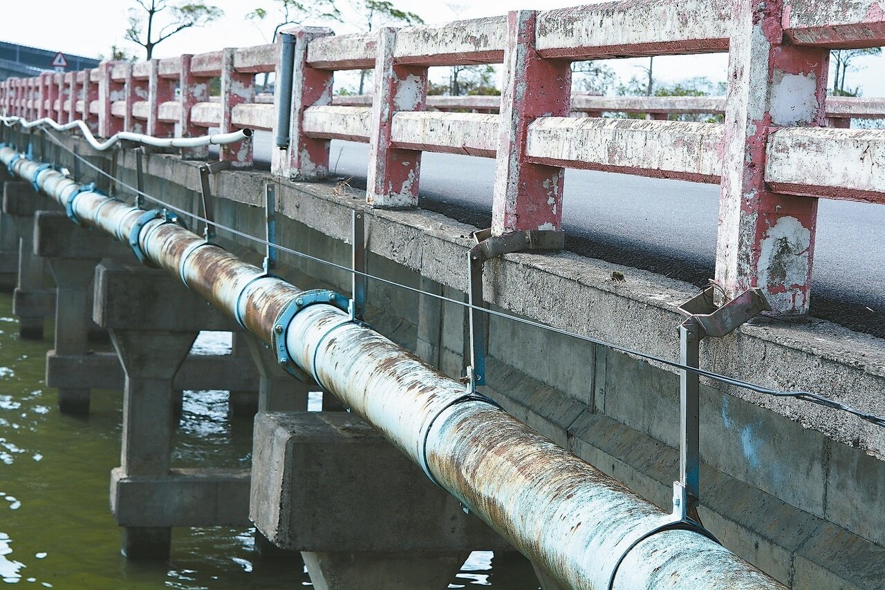 嘉冬橋上加掛的自來水管,供給珍珠社區用水,武淵村長張梓柱說,上月經過時,發現18處固定水管不鏽鋼固定架被偷走,水管搖搖欲墜,僅靠另外一半的固定架支撐,他立刻向公所反映。