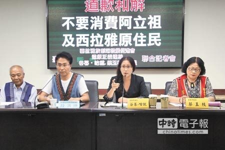 多位西拉雅族人16日齊聚台南市議會,在台南市議員谷暮‧哈就與蔡玉枝主持下,抗議鎮門宮藉法會消費原住民與阿立祖。蔡玉枝表示,廟方想道歉、和解沒關係,但要先跟原住民討論,彼此了解,勿搞成消費族群意識。