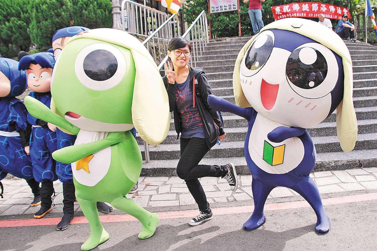 遊客開心與KERORO軍曹合影,為內灣車站前新竹國際動漫藝術節帶來熱鬧滾滾氣氛。(記者蔡昕穎/攝影)
