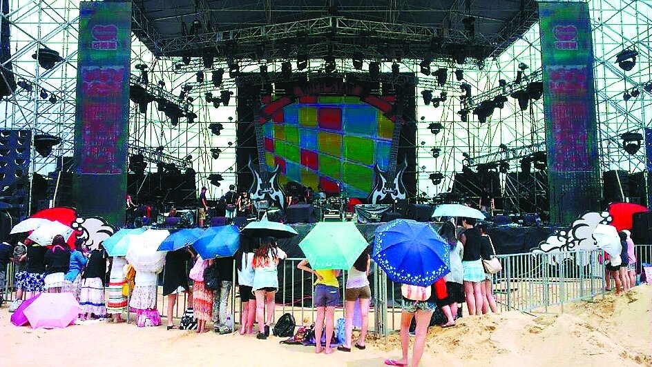 貢寮海洋音樂祭今起開唱,一早就有樂迷頂著大太陽、撐著陽傘,到福隆沙灘會場卡位。(記者陳珮琦/攝影)