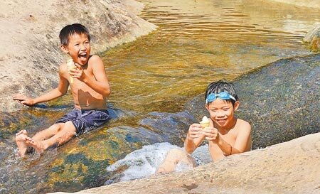 這樣不怕熱大台北地區8日創下台北氣象站設站以來的最高溫39.3度紀錄,有民眾到外雙溪避暑,一支叭噗冰加一灣清涼溪水,成為高溫炎夏的最佳選擇。(記者王爵暐/攝影)