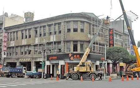 業主雇工將巨幅看板拆除,老屋可望重現往日風華。(記者林和生/攝影)