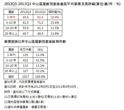 從屋齡來看,中山區屋齡3年內套房成交單價仍持續創新高,各屋齡別的套房產品漲幅都在1成以上,並以3年內套房漲幅19.9%最高,永慶房產集團研究發展中心經理黃舒衛指出,中山區3年內套房產品由於市場釋出少,民眾追高意願強。