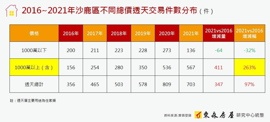 隨著近年台中精華區土地開發日益飽和,眾多建商紛紛將目光轉向沙鹿,新案開價屢創新高,也同步墊高了中古屋行情。以過往買氣最佳的透天厝來看,依實價登錄揭露,2021年總價超過1000萬元的透天成交567件,與2016年的156件相比,短短5年的成長幅度達263%、接近3倍,房市熱度之高可見一斑。