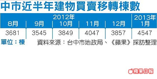 台中市政府地政局昨公布2013年1月建物買賣移轉棟數為4547棟,較上月3857棟與去年同期2788棟分別增加17.8%、63%,也是自去年8月實價登錄上路以來的新高,顯示買氣有回溫趨勢。台中市政府地政局表示,1月建物買賣移轉棟數以西屯區782棟最多,其次為北屯區454棟,與南屯區404棟,這3區向來是台中市購屋3大熱區。且以過去經驗來看,往年台中在過年前的交易熱度較高,因大部分民眾想趕在過年前把手上的土地所有權或建物處理完畢,心裡比較不會有牽掛,可以輕鬆過好年。
