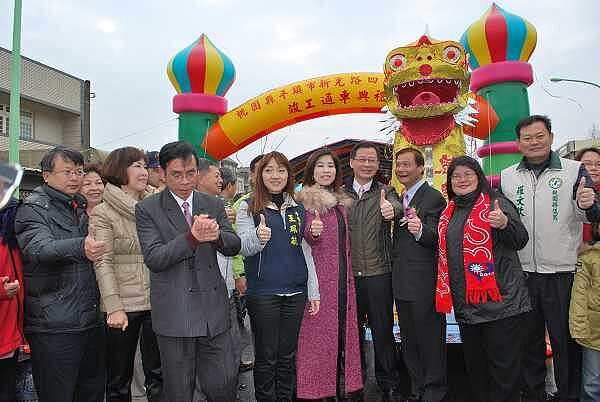 平鎮新光路四段道路拓寬工程竣工通車典禮,立法委員呂玉玲、縣長吳志揚、市長陳萬得和代表會主席黃農幀及主秘呂超群、各級民意代表一同剪綵。(記者潘瑞如攝)