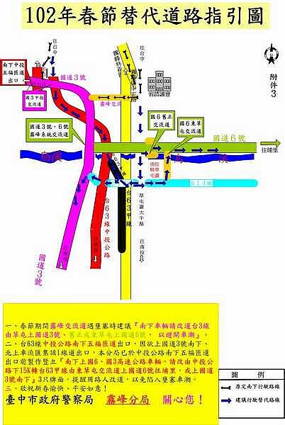 台中市政府警察局霧峰分局有鑑於每年春節期間外出旅遊、返鄉過年及回娘家車流量甚大,且霧峰地區又因聯接南投縣埔里、日月潭等風景區,為免因民眾行車遇阻塞影響心情,所以規劃替代道路示意圖提供用路人參考: