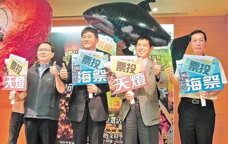 新北市議員顏世雄、觀旅局長陳國君、平溪區長簡華祥、貢寮區長徐溪祥(左至右)9日手持標語,共同為平溪天燈節、貢寮海祭進入「台灣觀光年曆票選」強力催票。(陳俊雄攝)