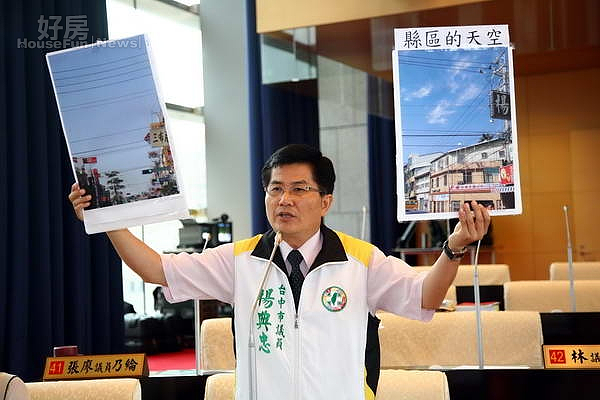 「海線和七期的天空差很多!」楊典忠議員指出,七期重劃區的天空豪宅林立、道路視野一覽無疑,但海線鹿寮商圈、梧棲老街的天空卻是電線滿佈,隨時有垂落的纜線和攀附的預備線圈,宛如「蜘蛛網」般雜亂無章,同樣台中市但卻宛如兩個世界;他強調,胡市長兩年半前就推動電線地下化,但至今只有舊台中市豪宅區如期完成,舊縣區的天空卻毫無改變。楊議員建議市府與台電協商,將台電收取的一半獲利用於改善電線桿周邊道路環境,加速推動電線地下化。