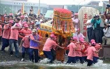 嘉義縣布袋鎮新塭嘉應廟每年農曆3月27日都會秉持傳統,舉辦極具地方宗教特色且沿襲數百年歷史的「衝水路、迎客王」廟會,今年再度吸引成千上萬信眾共襄盛舉,六日上午眾家神明在人手一柱清香的信徒簇擁下,陸續集結在新塭大排王船碼頭,參與這項十分特殊的廟會活動。