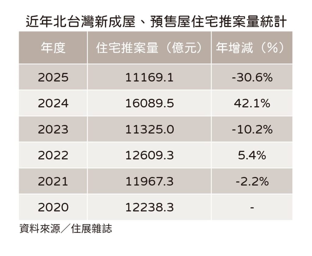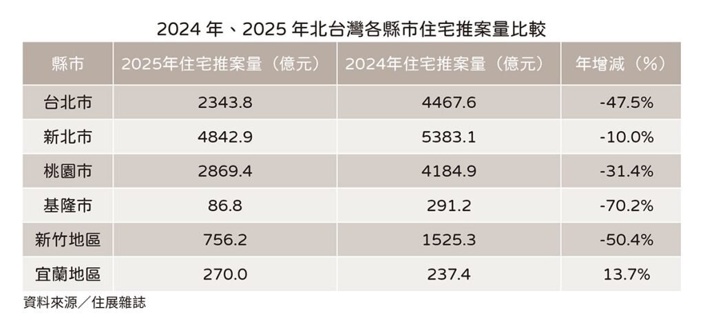 住展雜誌統計2025年北台灣新成屋、預售屋住宅產品推案量達1.1兆元,不敵大環境冷氣團比去年下修三成,雖仍為兆元水位,但為2020年破兆紀錄以來最低。推案熱區北北桃竹以新竹地區年減幅最深,減少50.4%,次低為台北市減幅47.5%。