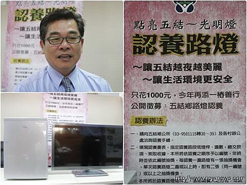 今年認養宜蘭縣五結鄉路燈者,可以參加抽獎,最大獎是電視和電冰箱!既可行善,又有機會中大獎。鄉長簡松樹25日呼籲善心人士、團體和企業,踴躍來認養,每年每盞1000元。