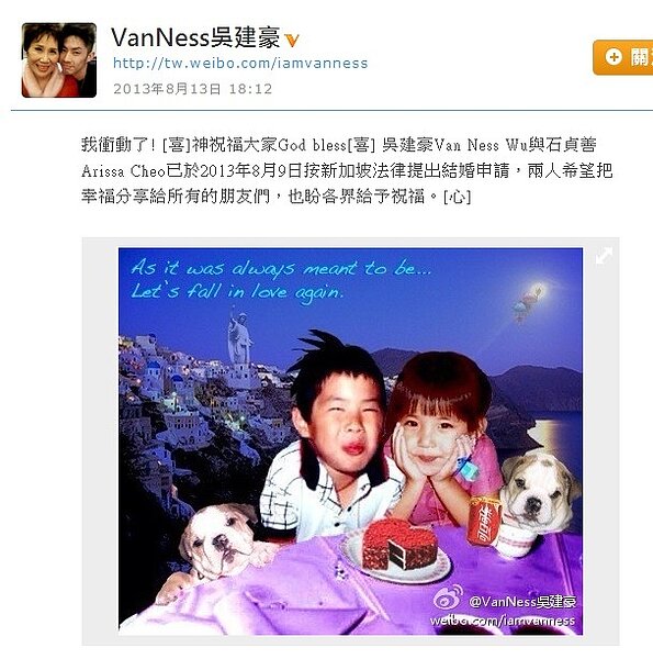 吳建豪選在35歲,娶了富家女友Arissa。(取自吳建豪微博)