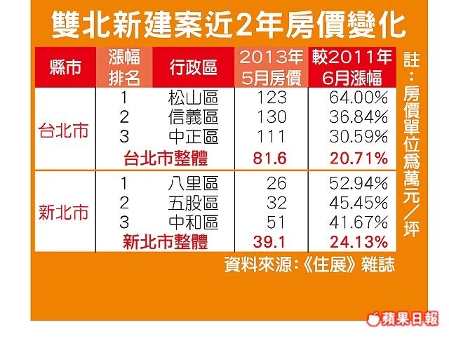 據《住展》雜誌統計,雙北市2013年5月新建案每坪均價各為81.6與39.1萬元,較2011年6月增20.71%與24.13%。《住展》雜誌研發長倪子仁表示,近2年大台北房價增漲逾2成,顯示房價並未因交易量縮而止漲。