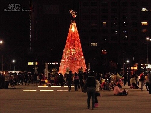 中市在市府大樓前廣場點亮16公尺聖誕樹。(記者賴淑禎攝)