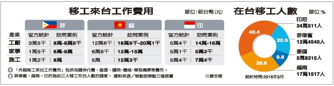 勞動部勞動力發展署表示,根據各國提供給該署的最新資料,仲介費數額大不同。但是據了解,不少移工實際貸款數額恐怕不只官方數字。