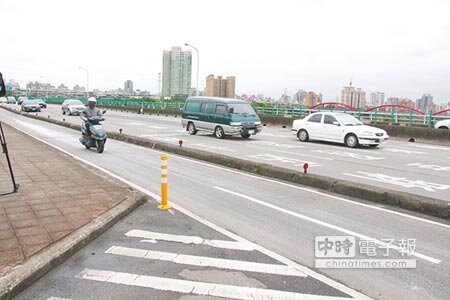 福和橋永和端在狹窄的機慢車道中仍有水泥分隔島,反而容易造成碰撞危險。(葉書宏攝)