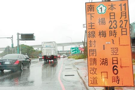 因應「國道一號五股楊梅段拓寬工程」施工,楊梅至湖口交流道雙向車道,將於今(廿七日)晚間十一時至廿八日早晨六時封閉,國工局呼籲民眾依指引標誌改道行駛。