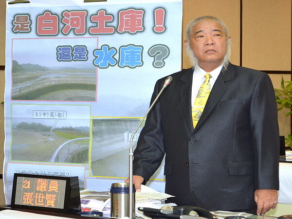 市議員張世賢說,白河水庫已變成白河土庫,沒有供水功能,蓄水如同小水溝,淤積嚴重有如土中行舟,農作灌溉得挖地下井,有造成地層下陷之虞,廢除或重建,市府及主管單位要早日決定,不要一直畫大餅。