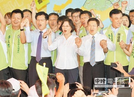 民進黨台中市長候選人林佳龍競選總部14日成立,黨主席蔡英文呼籲選民用選票讓中台灣翻轉變天。南投縣長候選人李文忠(前排左起)、台中市長候選人林佳龍、黨主席蔡英文、彰化縣長候選人魏明谷與競選總部主委蘇嘉全在台上高呼凍蒜,現場氣氛沸騰不已。(記者范揚光/攝影)